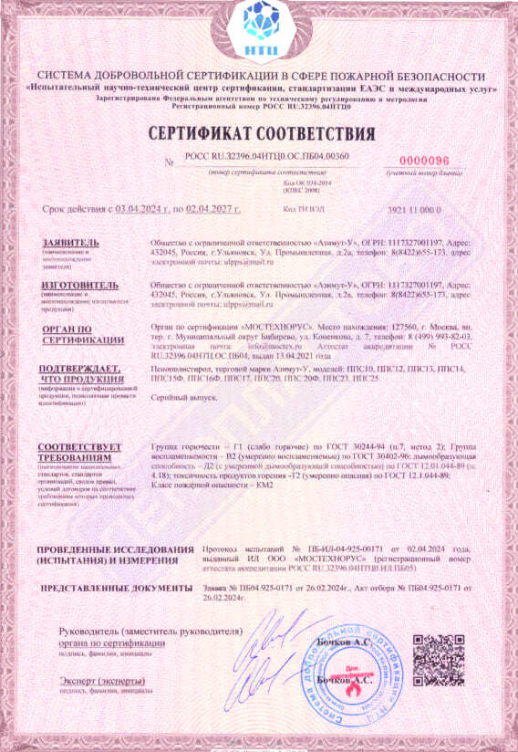 Пенопластово производит самозатухающий пенополистирол. Чтобы понизить горючесть, в них вводят негорючие и пламегасящие добавки (антиперен). Таким образом появился самозатухающий тип пенопласта. (Антипирен — компонент, добавляемый в материалы органического происхождения с целью обеспечения огнезащиты.)